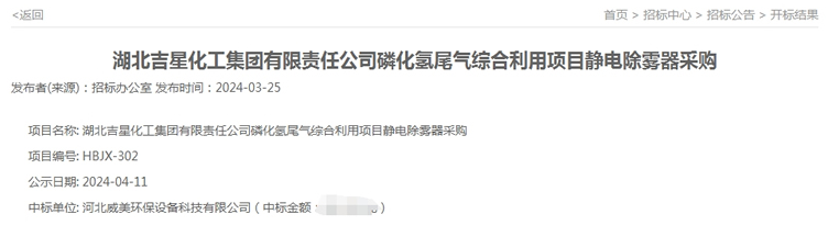 河北威美環(huán)保中標磷化氫尾氣綜合利用濕電除霧器項目