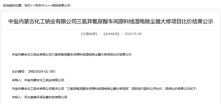 河北威美中標中鹽內(nèi)蒙古三氯異氰尿酸車間濕電除霧器大修項目,以下是比價結(jié)果公告